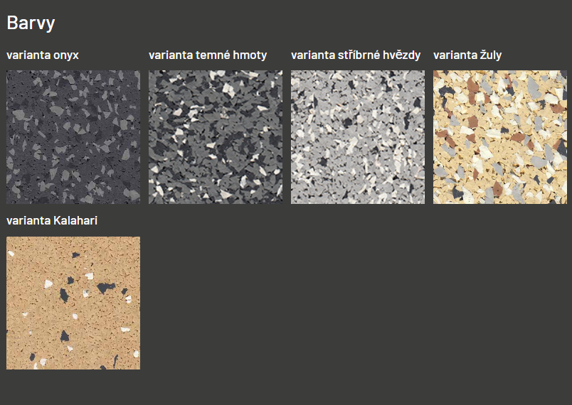Podlaha Sportec Variant představuje exkluzivní variantu pro náročné klienty. Zákazník si sám volí barevné kombinace, a to až pěti barev z pestrého vzorníku EPDM. Zároveň si určuje podíl barevných granulí a černé pryže. Sportec Variant představuje elegantní a funkční řešení pro podlahy fitness center, kanceláří, obchodů či reprezentativních showroomů. Vzhledem k nepřebernému množství barevných kombinací lze podlahu ideálně přizpůsobit designu místností. Uživatelé ocení i pohodlnou chůzi, snížení hluku a snadnou údržbu. Sportec Variant lze objednávat pouze od určitého množství, pokud zvolíte vlastní mix barev. Pět základních barev Dark Matter, Onyx, Silver star, Granit a Kalahari lze objednávat od 1 role. Ostatní barevné varianty, které si zákazník může sám namíchat se vyrábějí na objednávku, minimální množství je viz. níže.