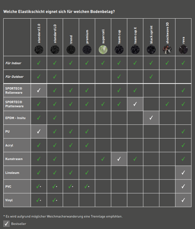 Výrobce elastických podkladních vrstev SPORTEC všechny materiály pečlivě testuje, aby pro dané sporty a využití vytvořil produkty, které odráží požadavky a specifika jednotlivých sportů. Níže naleznete doporučení, pro jako sportovní povrchy lze používat tyto konkrétní elastické podkladní vrstvy: